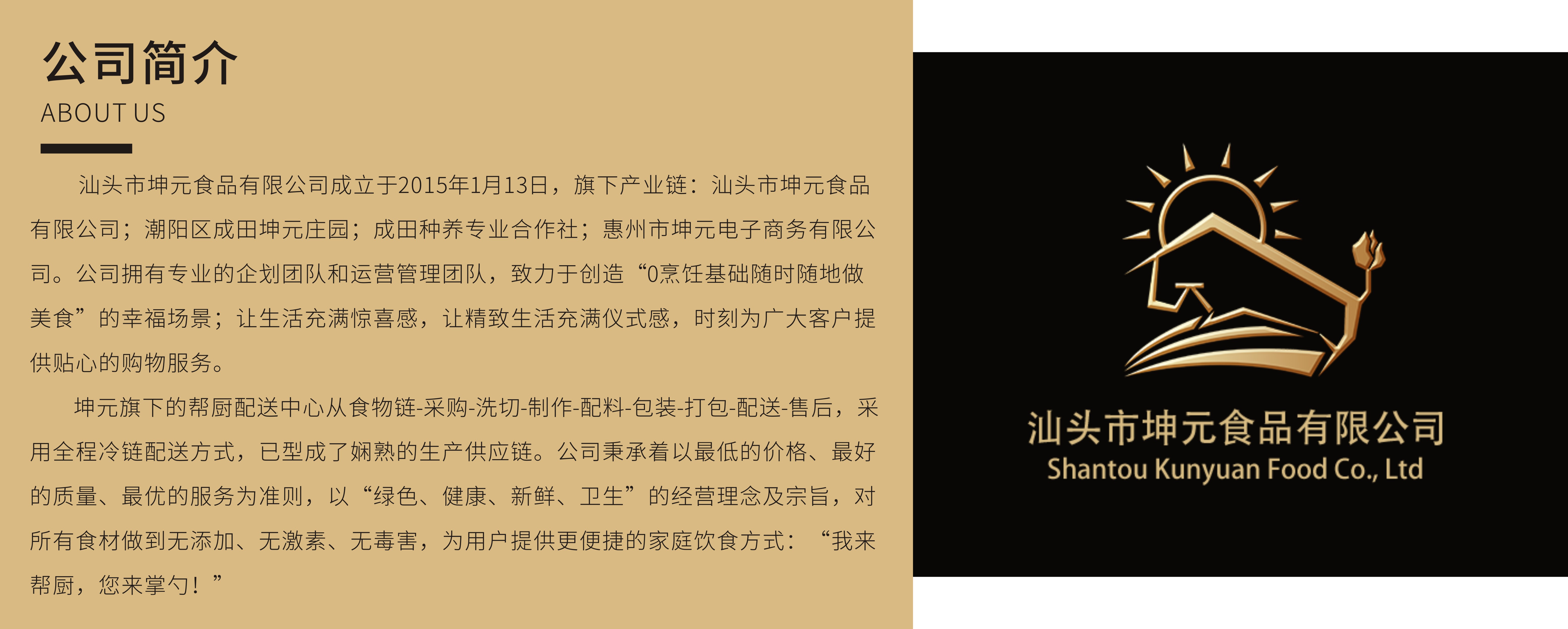 • 坤元幫廚配送中心致力于創造“0烹飪基礎隨時隨地做美食”的幸福場景;讓生活充滿驚喜感,讓精致生活充滿儀式感,時刻為廣大客戶提供貼心的購物服務。從食物鏈-采購-洗切-制作-配料-包裝-打包-配送-售后,采用全程冷鏈配送方式,已型成了嫻熟的生產供應鏈。公司秉承著以最低的價格、最好的質量、最優的服務為準則,以“綠色、健康、新鮮、衛生”的經營理念及宗旨,對所有食材做到無添加、無激素、無毒害,為用戶提供更便捷的家庭飲食方式:“我來幫廚,您來掌勺!”